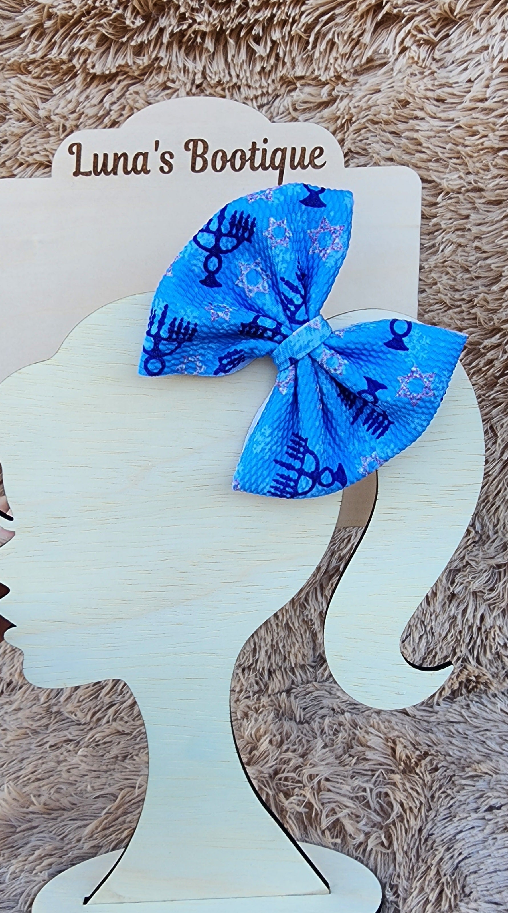 Top off your Hanukkah outfit with this festive bow! Featuring the iconic symbols of the holiday, and a boo-tiful Blue, Navy, and Silver color scheme. This bow is sure to bring the cheer! 'Cause who wants to celebrate without looking their best? Dazzle your friends and family with this perfect accessory!